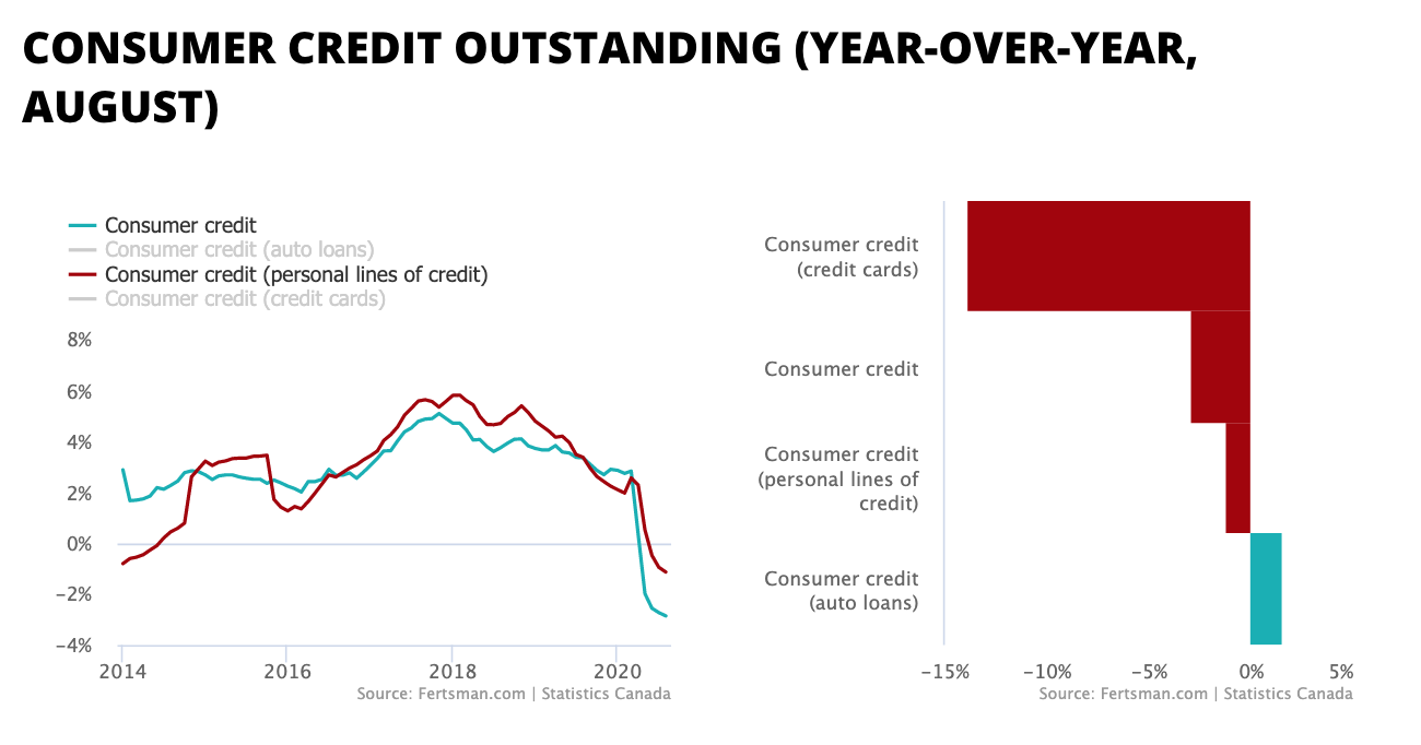 The biggest contraction in the consumer credit market has been in the credit card segment, dropping a significant 13.82% in August. From the same time last year, outstanding credit card balances are down by almost $12 billion CAD. Total outstanding credit card debt is now at $73.5 billion CAD.