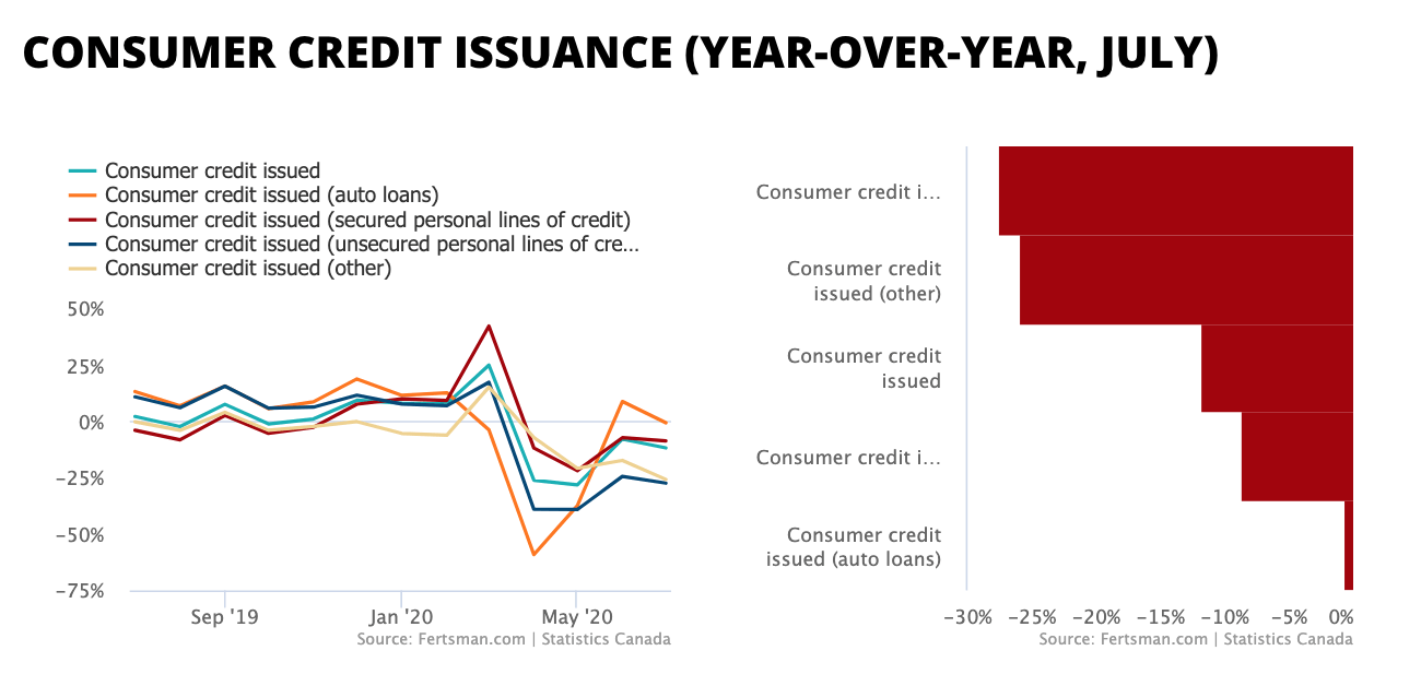 Unsurprisingly, the biggest drop in credit issuance in the consumer credit market in July was in unsecured personal lines of credit, coming in at 27.38%. It fell even more back in April, coming in at 39% year-over-year. Even secured personal lines of credit issuance was down in July, dropping 8.6%.