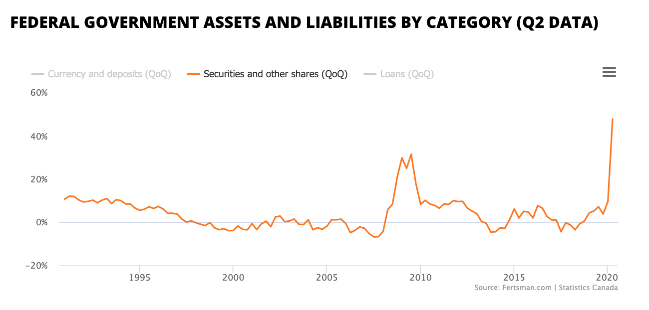 As a result of the record breaking securities issuances, the federal government is now sitting on a record $163 billion CAD worth of currency and deposits. The post-2008 finance crisis stockpile of currency and deposits only reached a high of $52 billion CAD.