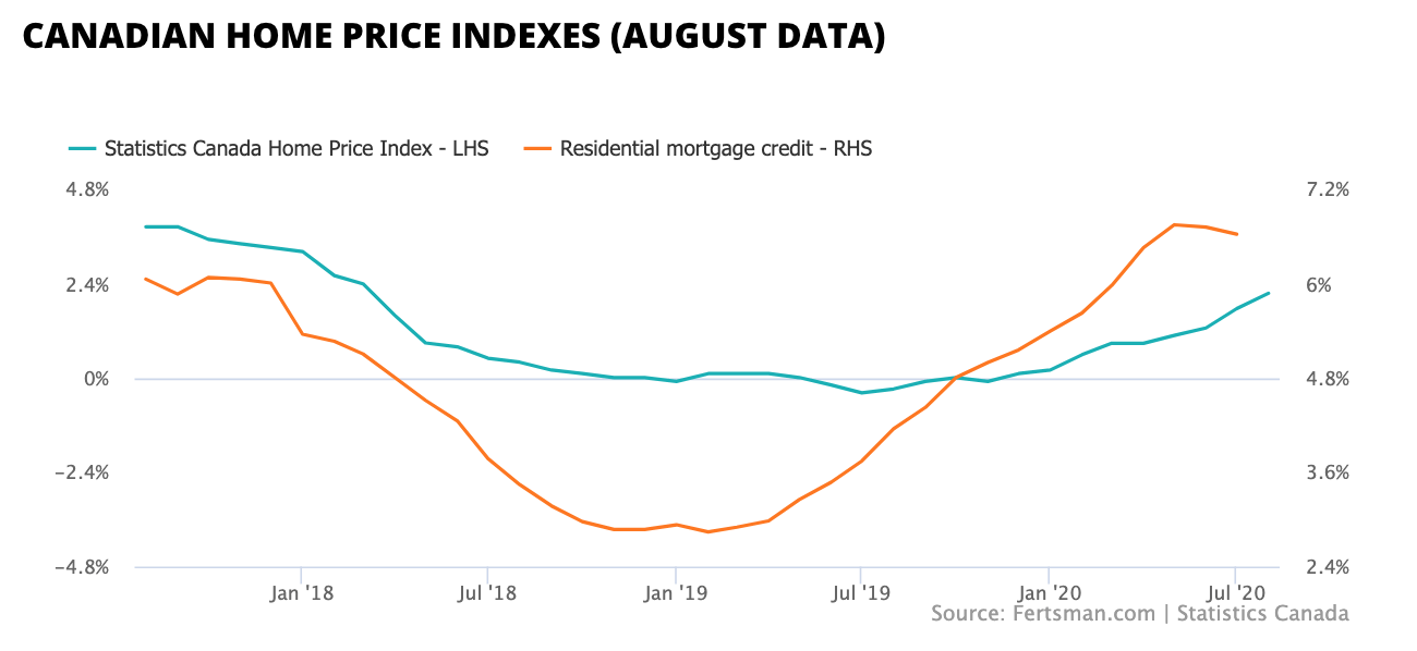 The latest data published by Statistics Canada and Teranet show that Canadian home prices grew strongly in August. Statistics Canada reports that its aggregate home price index rose over 2.14% year-over-year, while Teranet reports that its composite index grew by 5.68% year-over-year. The strength in the housing market comes from strong demand enabled by record residential mortgage growth, as we reported last week. This demand is putting considerable pressure on new and existing housing inventory levels, resulting in significant market competition in the form of bidding wars.