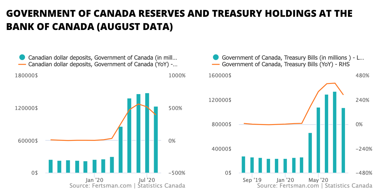 Based on the data from earlier this year, the Bank of Canada substantially increased its purchases of treasuries to substantially increase the amount of money available to the government. In April, treasury holdings increased to over $65 billion CAD, peaking in July at over $133 billion CAD. As a result, the government's reserve holdings increased to $85 billion CAD in April, peaking in July at over $148 billion CAD.