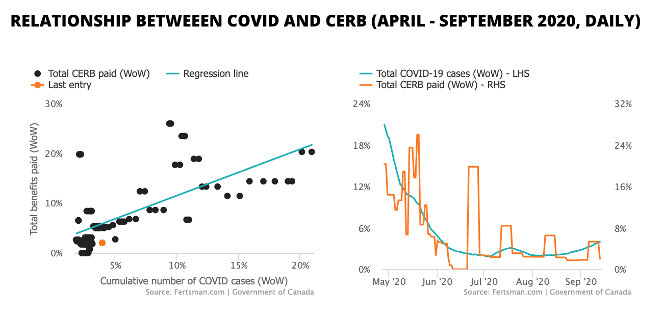 The charts above show the relationship between total CERB paid and total COVID-19 cases reported. Growth in total CERB benefits paid measured on a week-over-week basis strongly followed growth in the total number of COVID cases reported on a week-over-week basis. In other words, when total COVID cases grew by a small percentage, total benefits paid out through CERB grew by a small percentage. And when COVID cases spiked, total CERB payouts spiked.