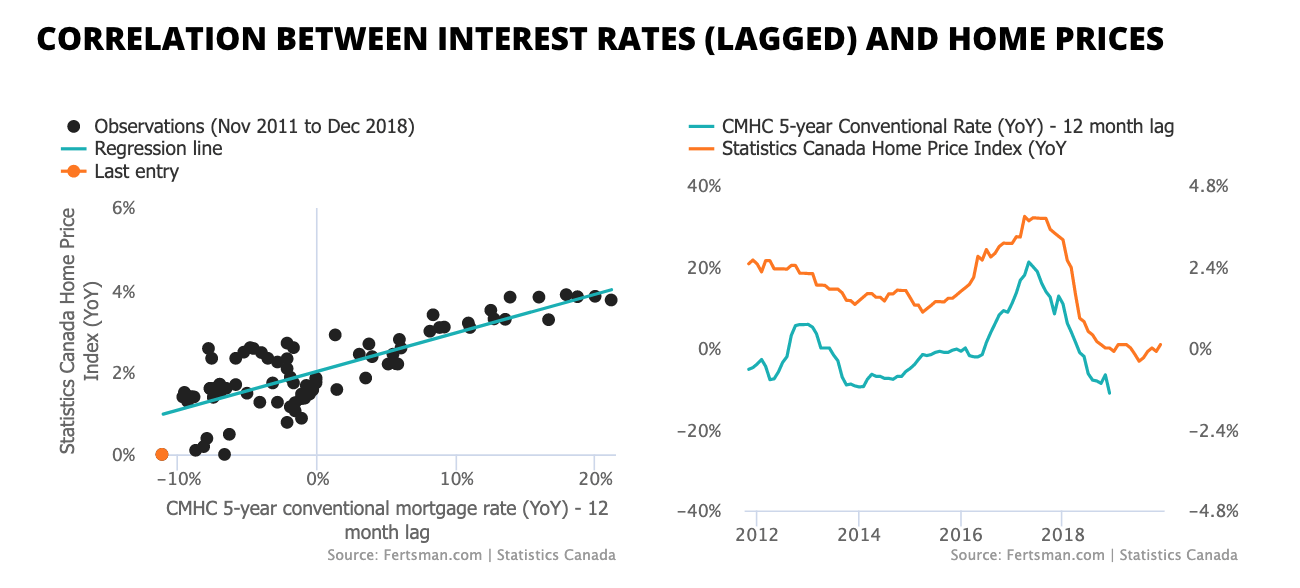 In terms of interest rates, they are not correlated with home prices the way most think. I have put together two charts above that capture the relationship between interest rates and home prices. I use data from Statistics Canada (see the charts above) for the period between November 2011 and December 2018. I have also lagged interest rates by 12 months to better "fit" the data and simulate potential real world effects.