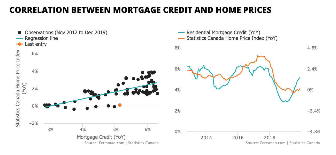 Above, you will find two charts that capture the relationship between residential mortgage credit quantities (in Canadian dollars) and home prices (as measured by Statistics Canada's home price index). Because the majority of deposits attained from a mortgage are spent on real estate transactions, we can safely assume that residential mortgage credit has an effect on the residential real estate market (the Statistics Canada home price index is a measure of prices in this market).