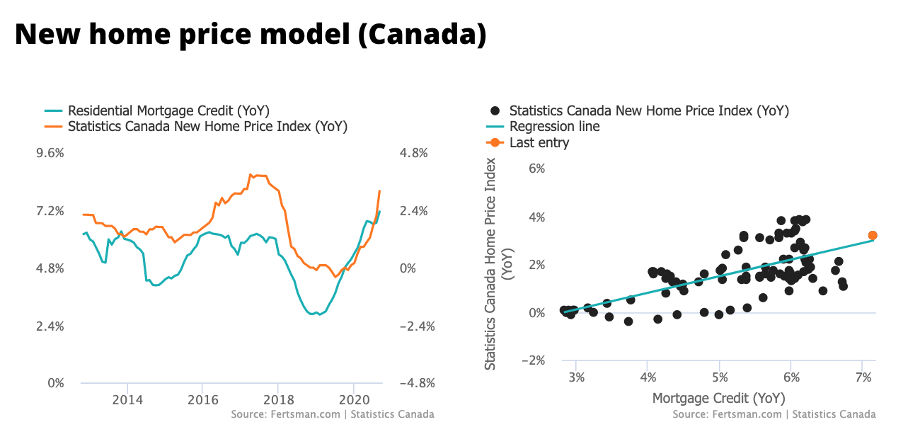 We use changes in commercial bank residential mortgage credit statistics to explain changes in the price of new (and used) homes. In September 2020, Canadian banks managed to grow the total pile of outstanding mortgage credit across Canada by 7.14% (or $85.85 billion CAD) from the same time the previous year. As a result, new home prices across the country grew by 3.2%.
